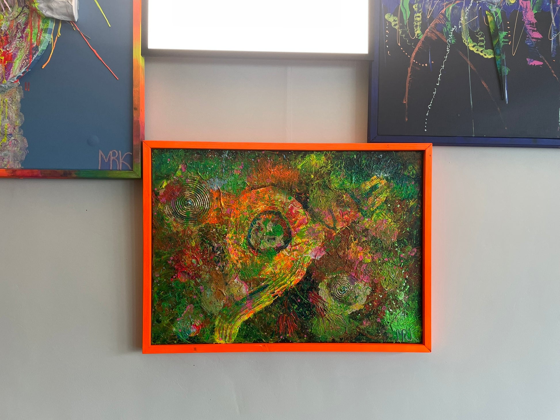 Der maßgefertigte Holzrahmen in Orange fasst die Leinwand ein und verbindet sich als Teil des Gesamtwerks mit der Farbgestaltung.