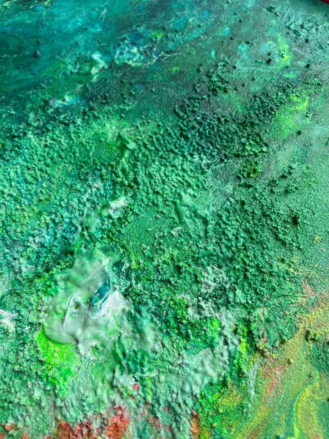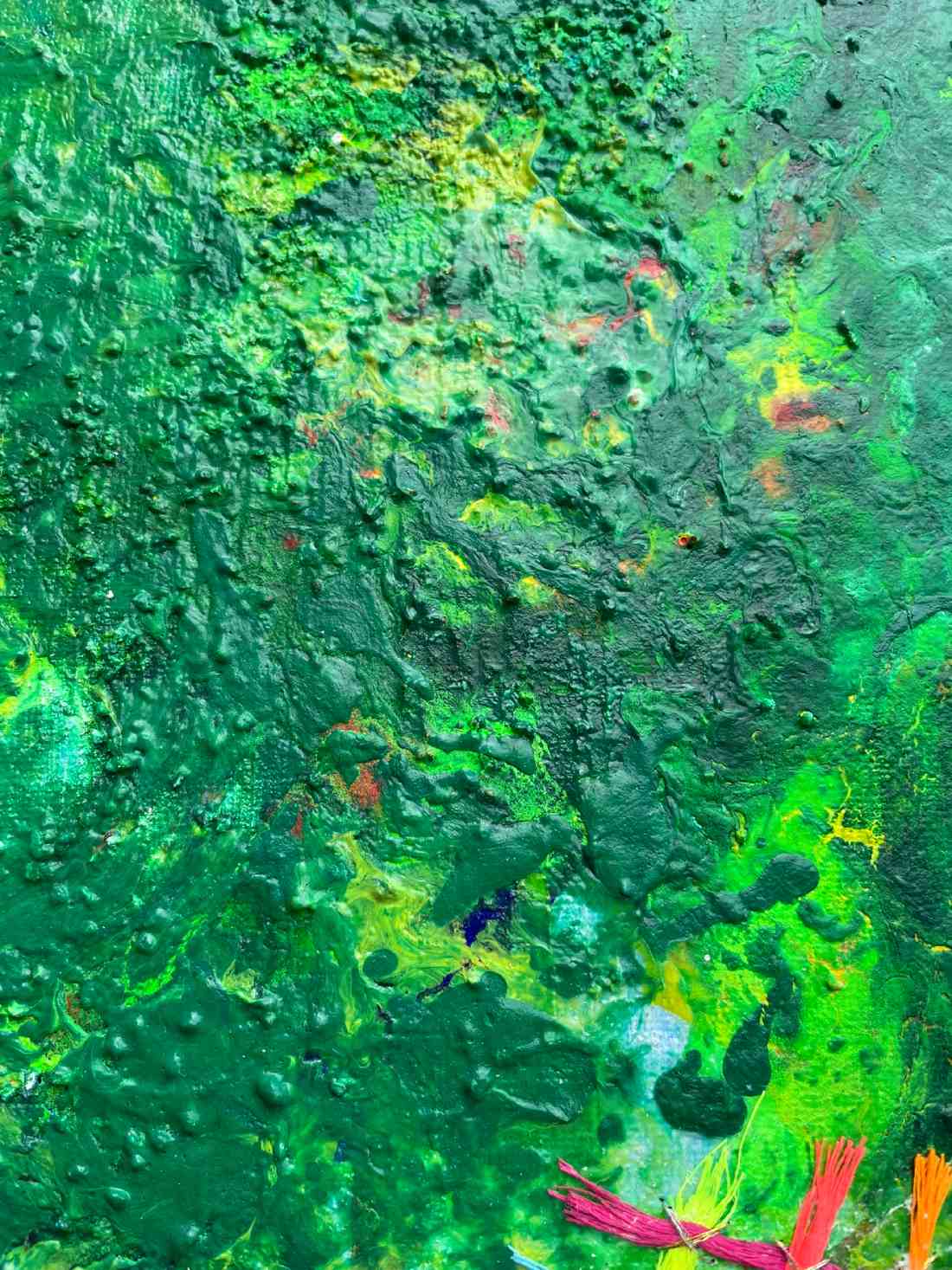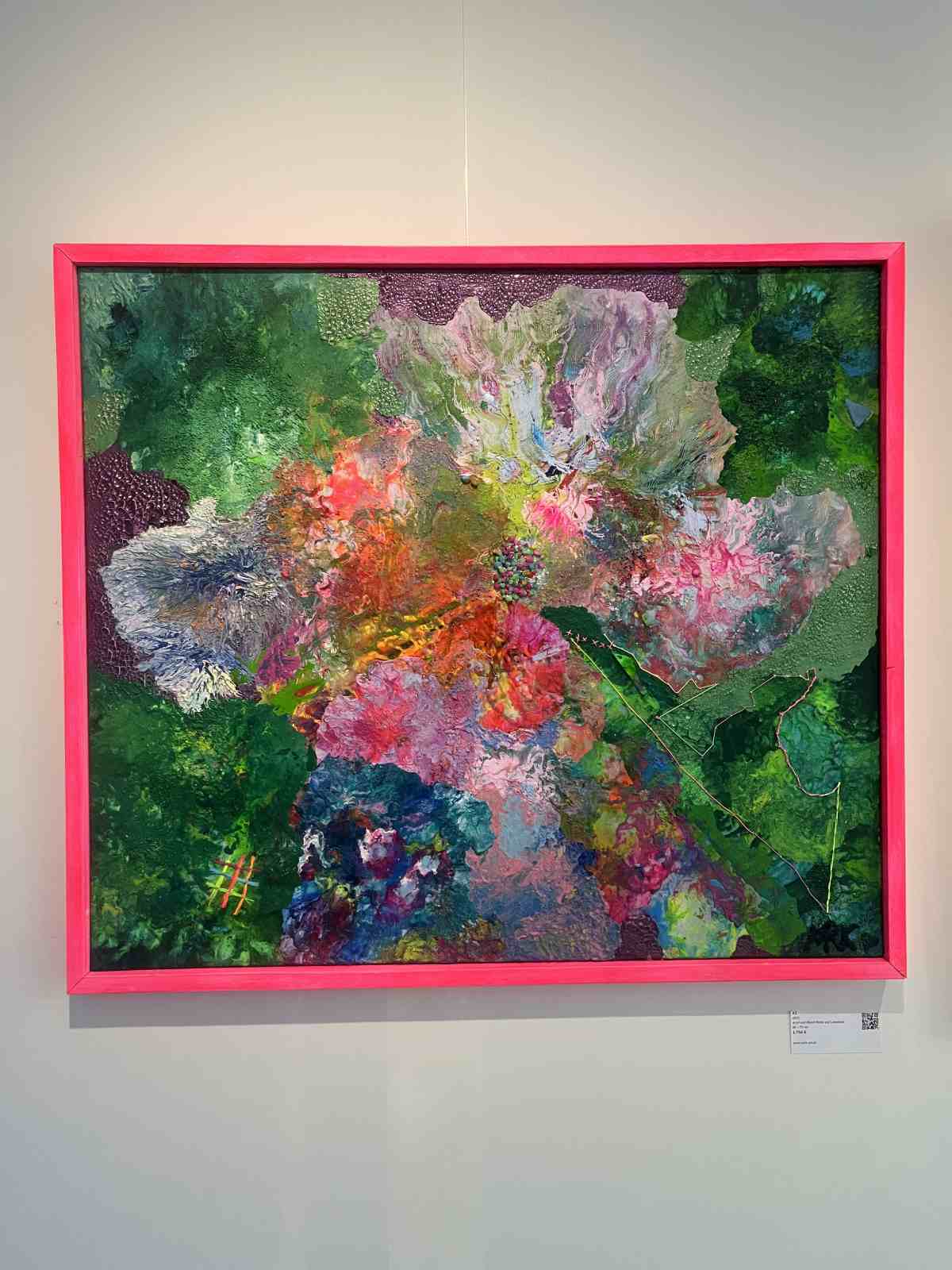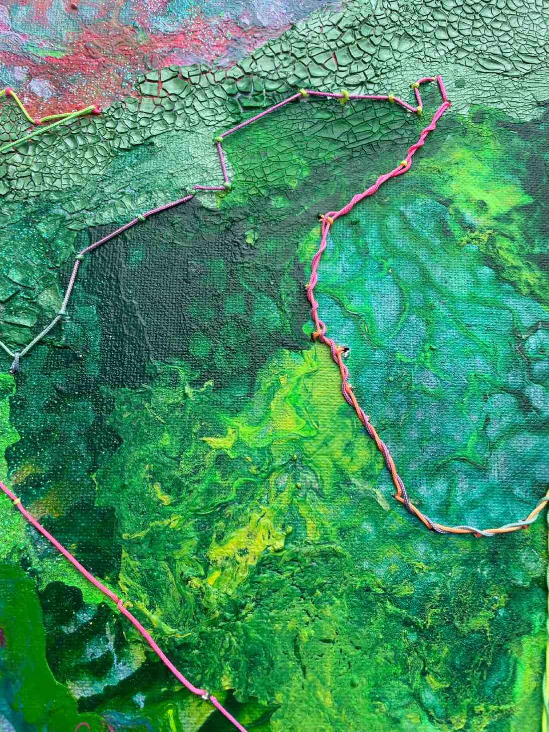 In diesem Werk begegnen sich Rosa- und Grüntöne in verschiedenen Nuancen. Farbiges Glas im Tiffany-Stil, kleine Steine, Fäden und Strukturpaste verbinden sich zu einer Oberfläche, die durch Licht und Perspektive immer wieder neue Eindrücke entstehen lässt.
