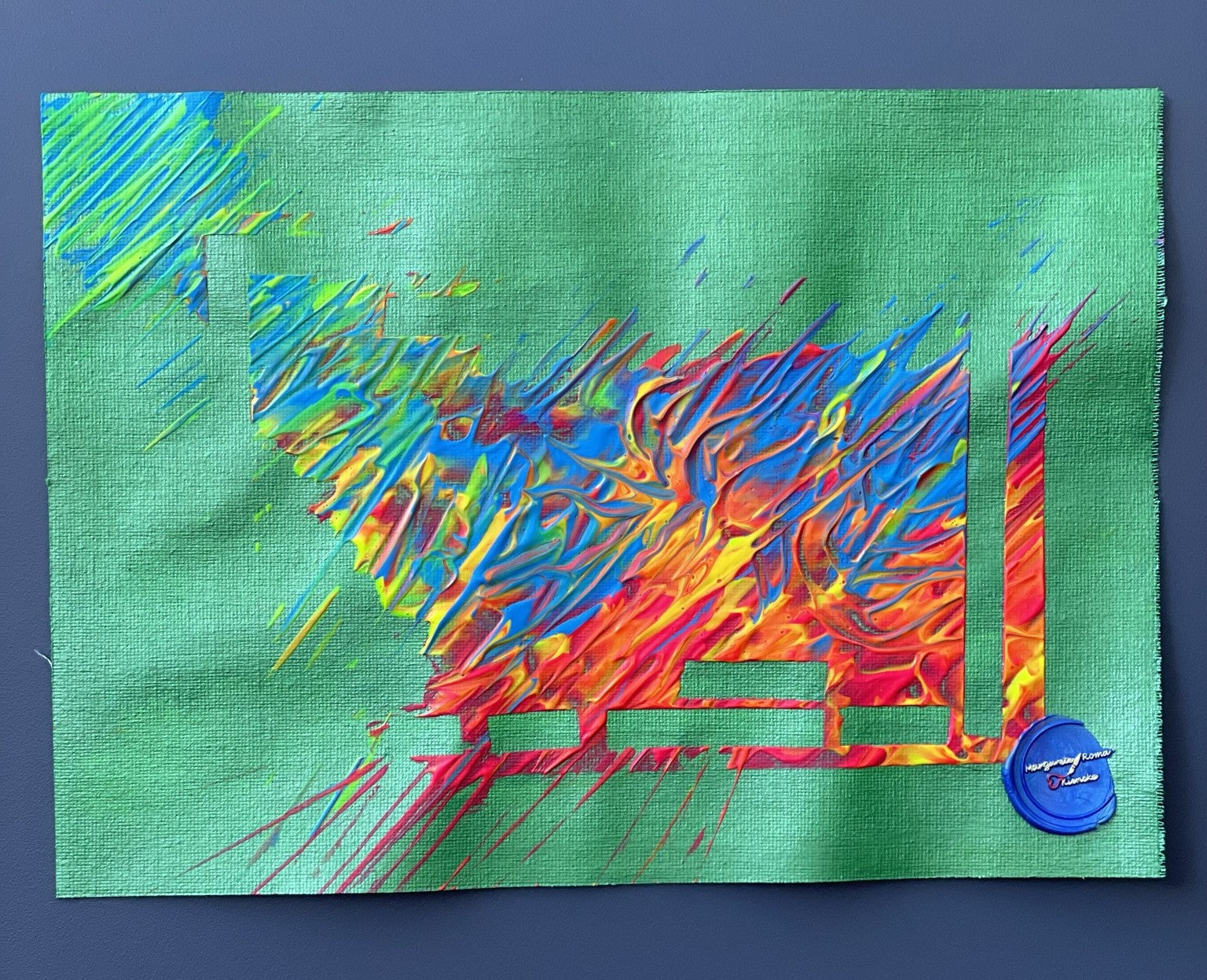 Ein metallisch-grüner Hintergrund bildet die Basis, auf der sich Blau-, Rot-, Gelb- und Grüntöne verteilen und in verschiedenen Übergängen begegnen.