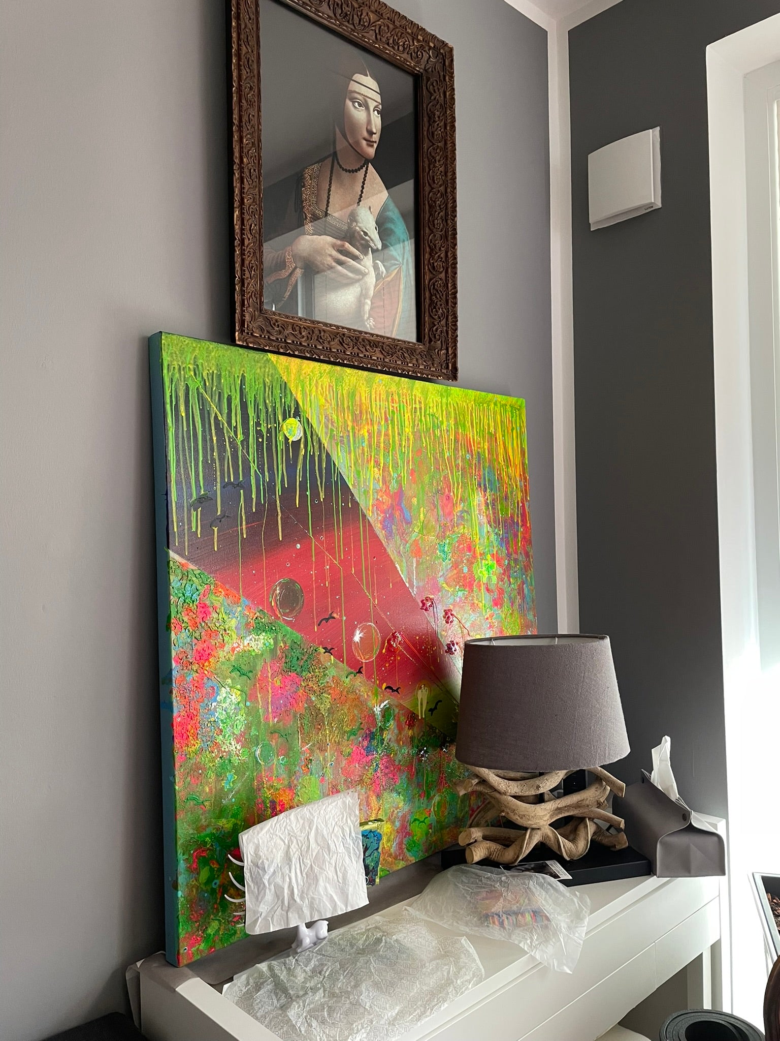 Der maßgefertigte Holzrahmen in Lila fasst das Werk ein und bildet einen klaren Abschluss zur Leinwand.
