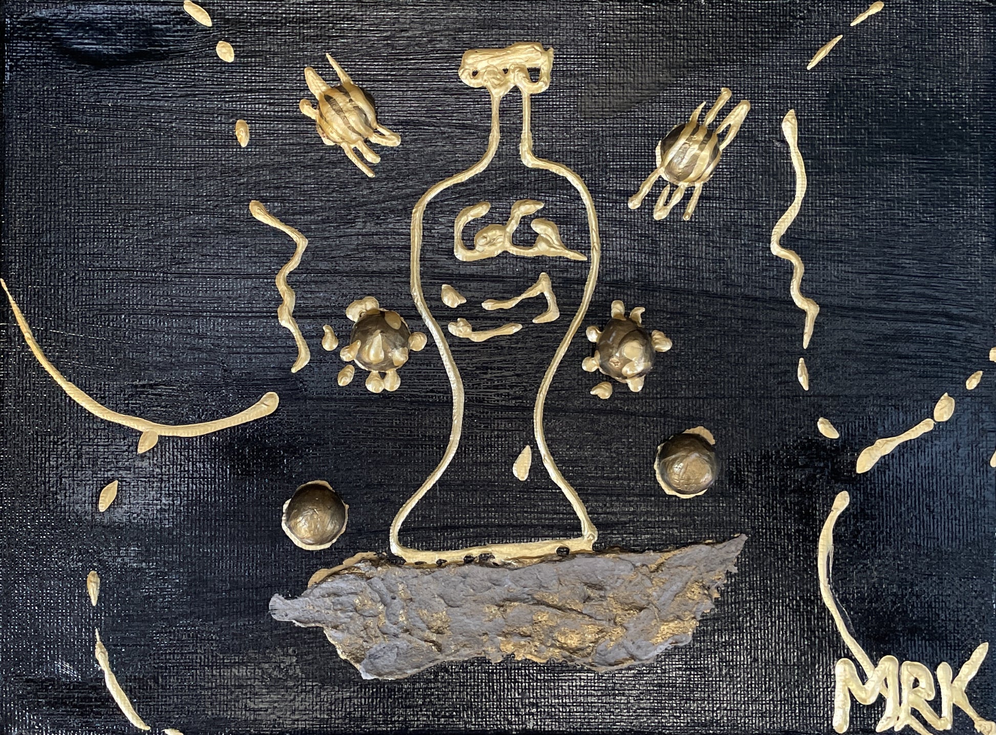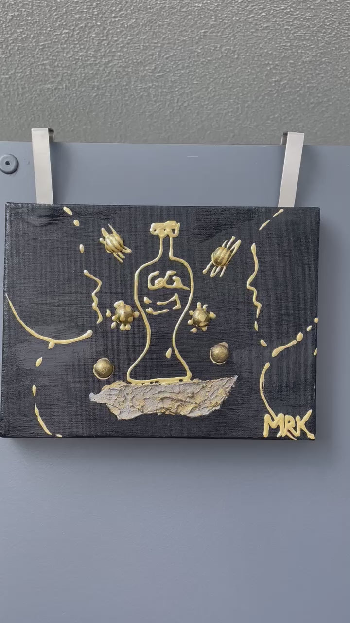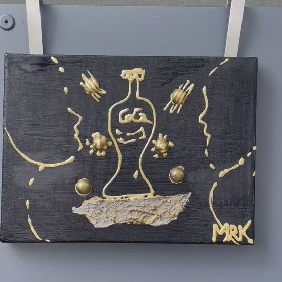 Die goldenen Akzente formen links und rechts angedeutete Gesichter, während in der Mitte eine Flasche hervorsticht – eine universelle Silhouette, die ikonisch wirkt und Erinnerungen wecken könnte. Die Flasche steht auf einer Basis aus grauer Modellierpaste, aus der goldene Akzente subtil hervorleuchten, als ob sie von innen heraus strahlen würden.