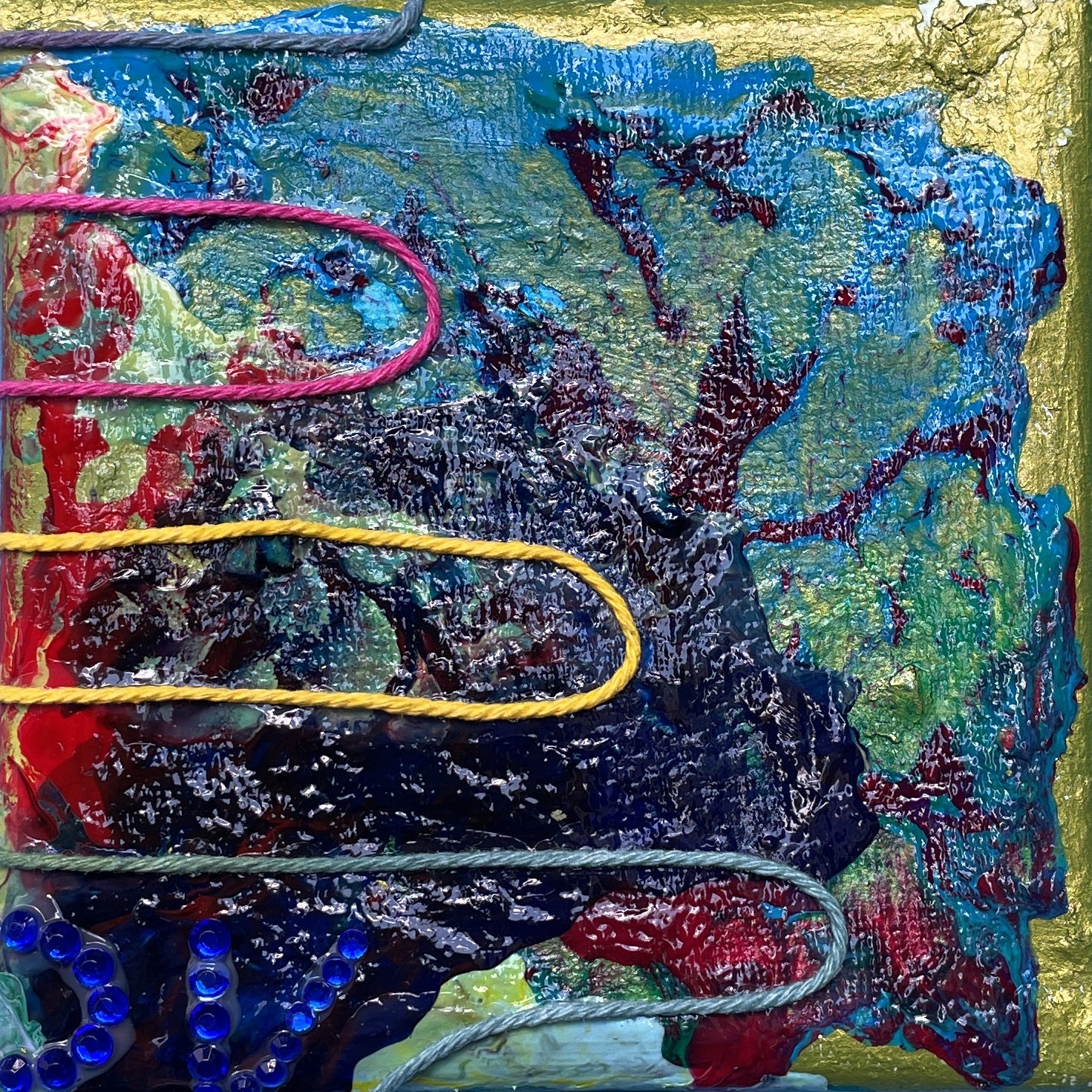 Die Leinwand (#5.2) begeistert mit goldenen, blauen, dunkelblauen und roten Farbübergängen. Der natürliche Farbverlauf lädt zum Staunen ein – hier wurde nichts künstlich aufgetragen, abgesehen von einem bunten Faden an der linken Seite, begleitet von Swarovski- und Kristallsteinen, die dem Bild zusätzliche Eleganz verleihen.