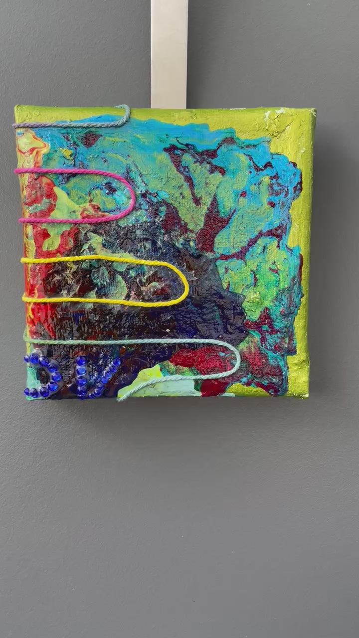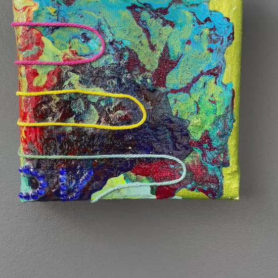 Ein Viertel der 20 x 20 cm Leinwand, verziert mit Swarovski-Steinen und funkelnden Kristallsteinen und einem bunten Faden.