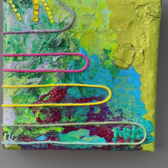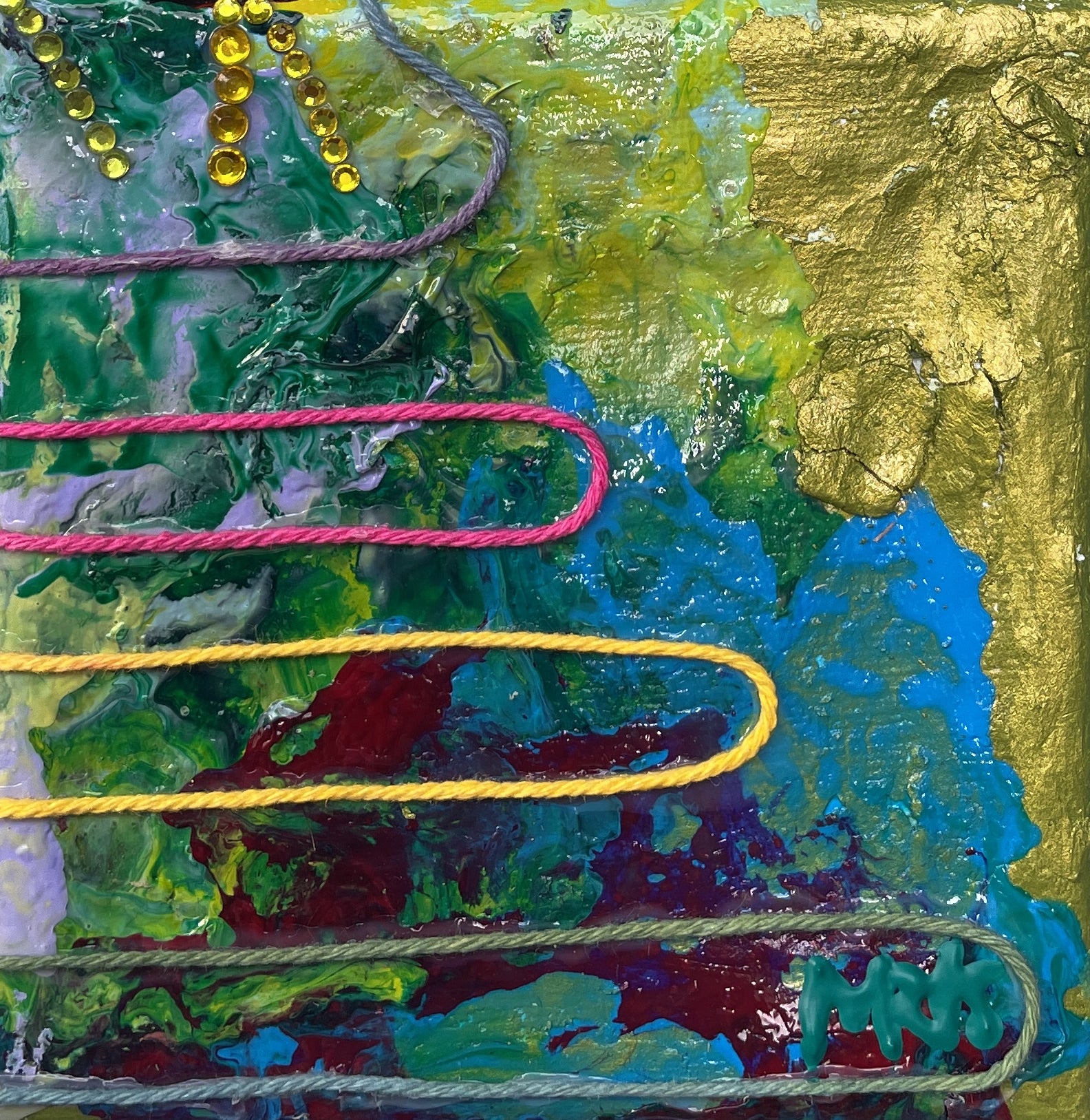 Die Leinwand (#5.3) trägt auf diesem Bild die Unterschrift "MRK". Auf der linken Seite ist der bunte Faden sichtbar, während oben links Kristallsteine glänzen. Die Farbverläufe in Gold, Blau, Grün und Gelb überwiegen, akzentuiert von helllila und rotem Farbton, was dem Werk eine starke visuelle Präsenz verleiht.