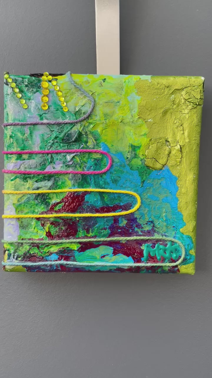 Ein Viertel der 20 x 20 cm Leinwand, verziert mit Swarovski-Steinen und funkelnden Kristallsteinen und einem bunten Faden.