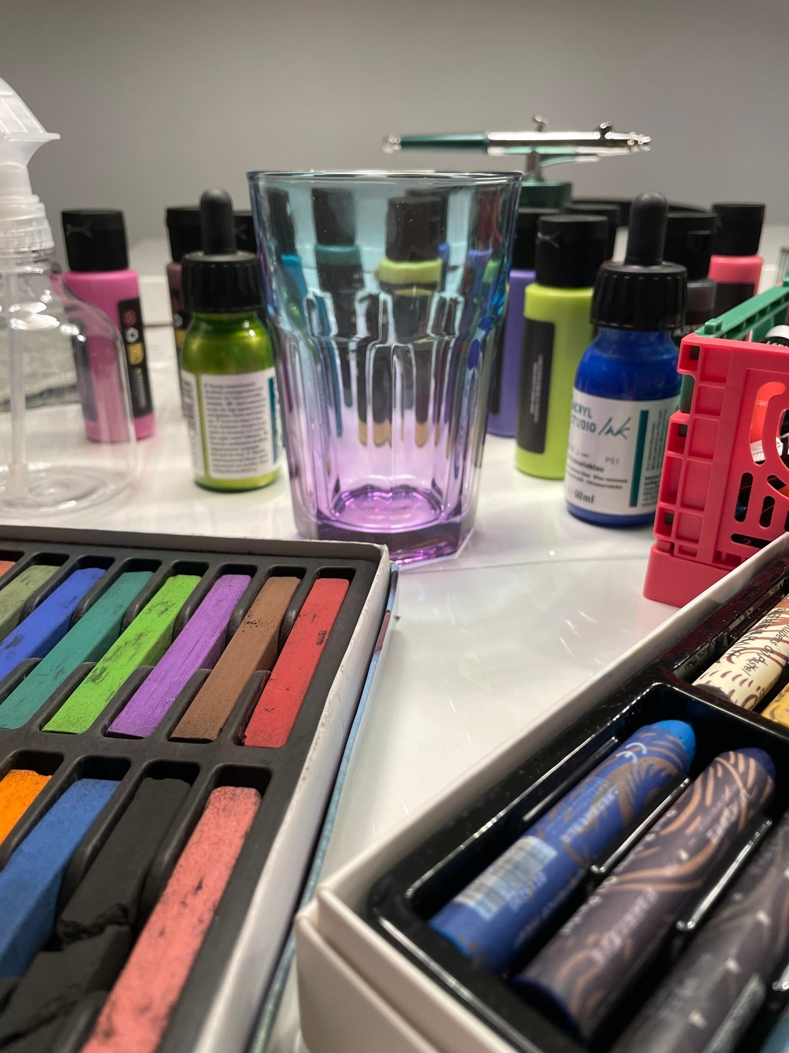 Alles, was du brauchst, steht dir im Atelier zur Verfügung - so kannst du frei experimentieren und verschiedene Techniken ausprobieren, ohne eigenes Material mitbringen zu müssen.